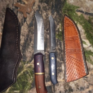 This is the second knife I have bought from here this one was for my daughter it was, her and my design for our hunting, fishing, and camping trips and, he nailed it, size, design, and he made it beautiful for her including the sheath the design of the sheath was completely his and he nailed it. I couldn't be happier and neither can my daughter. Both blades are shown for comparison the smaller is the size of a Motorola Razor in length